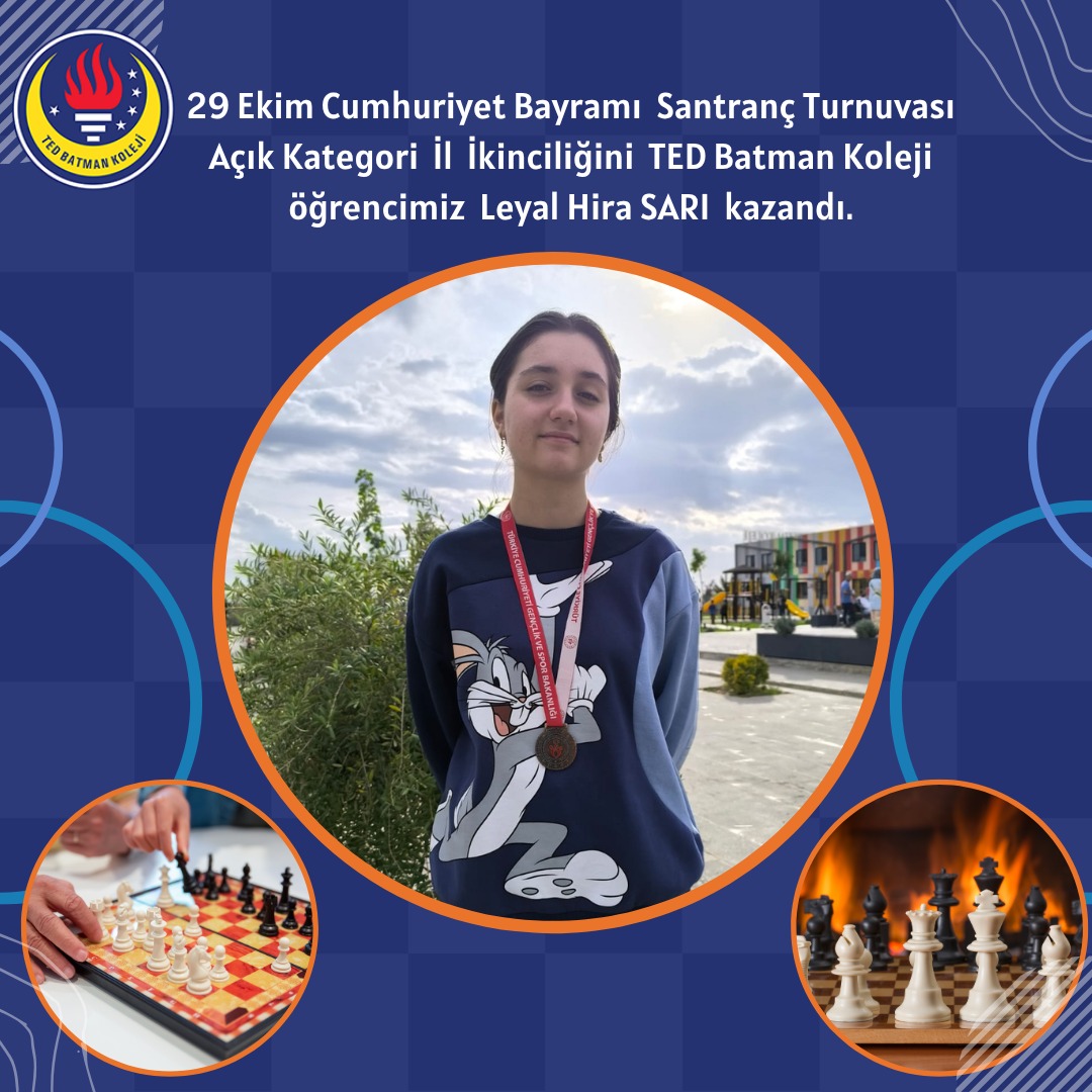29 Ekim Cumhuriyet Bayramı Satranç Turnuvası’nda, Açık Kategori İl İkinciliğini elde eden öğrencimiz Leyal Hira SARI’yı tebrik ediyoruz.