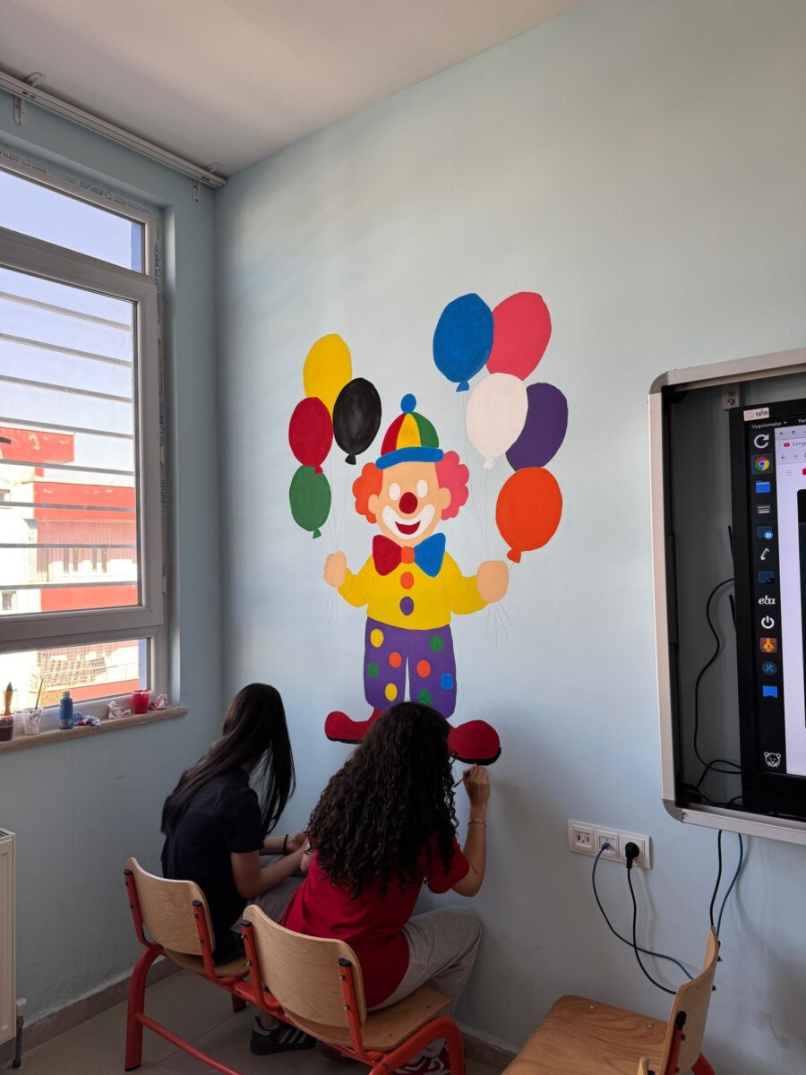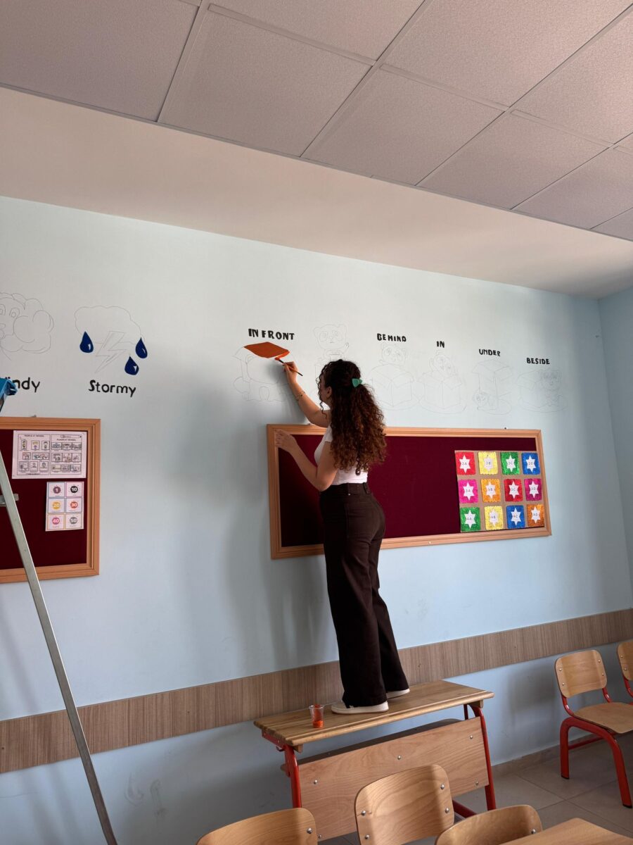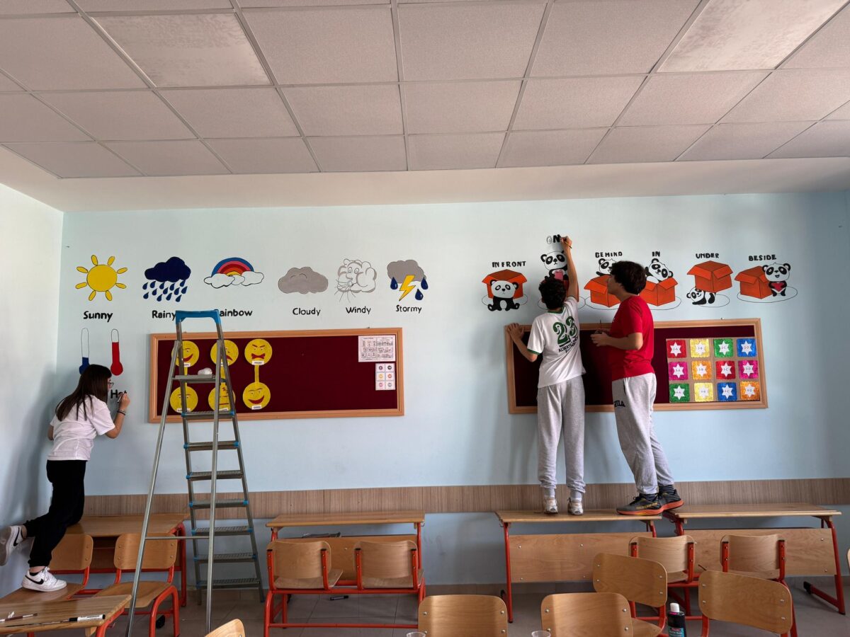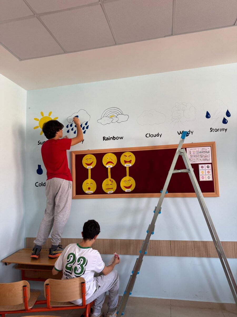 5 öğrencimiz, Kıbrıs Şehitleri İlkokulu’nun İngilizce sınıfında önceden hazırladıkları görselleri duvarlara uygulayarak sınıf ortamına renk ve estetik bir dokunuş kazandırdılar. 🌿