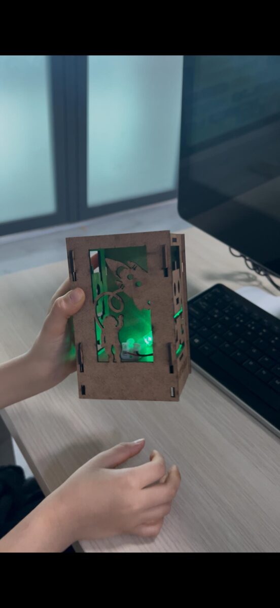 Ardından ahşap malzemelerle birleştirerek özgün gece lambası tasarımlarımızı oluşturduk.